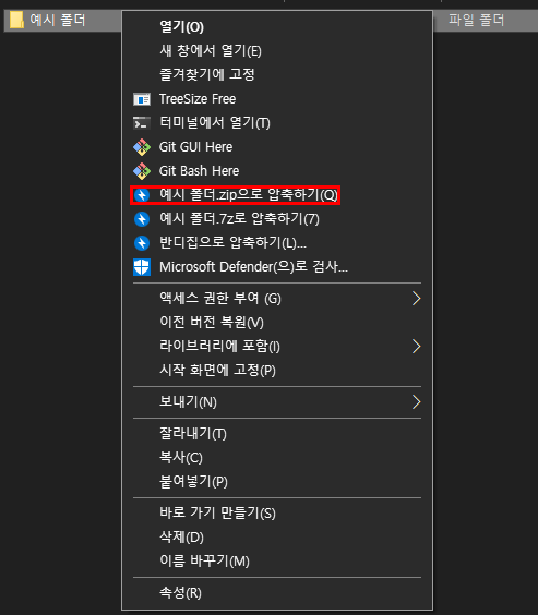 아래 이미지 처럼 원하는 폴더 우클릭 - [(폴더이름).zip으로 압축하기(Q)] 순서로 눌러주시면 됩니다.