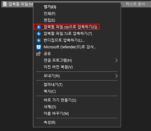 아래 이미지 처럼 원하는 파일 우클릭 - [(파일이름).zip으로 압축하기(Q)] 순서로 눌러주시면 됩니다.