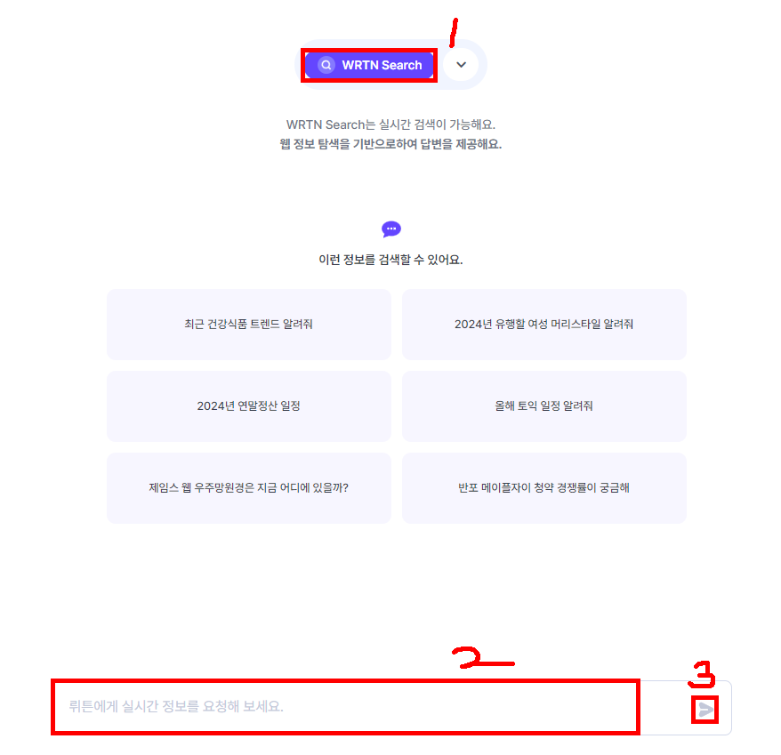 아래 이미지처럼 메인 화면에서 'WRTN Search' 모델을 선택하시고 사용하시면 됩니다.